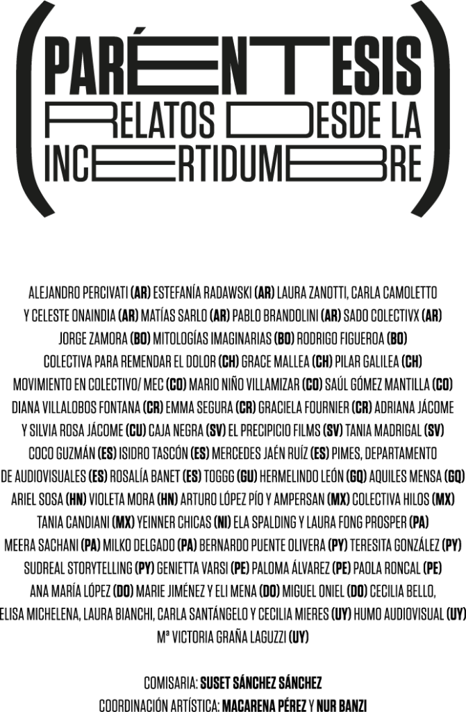 Paréntesis. Relatos desde la incertidumbre ofrece un amplio espectro de reflexiones personales y colectivas, que relatan las plurales experiencias de la pandemia en distintos contextos geopolíticos. Estos proyectos artísticos – de Latinoamérica, Guinea Ecuatorial y España – nos aproximan a las incertidumbres de un tiempo presente atravesado por las crisis políticas, sociales y económicas derivadas de la excepcional situación global vivida por la pandemia y abordan el complejo horizonte existencial post-COVID desde los territorios de la estética, la poesía y el discurso crítico.